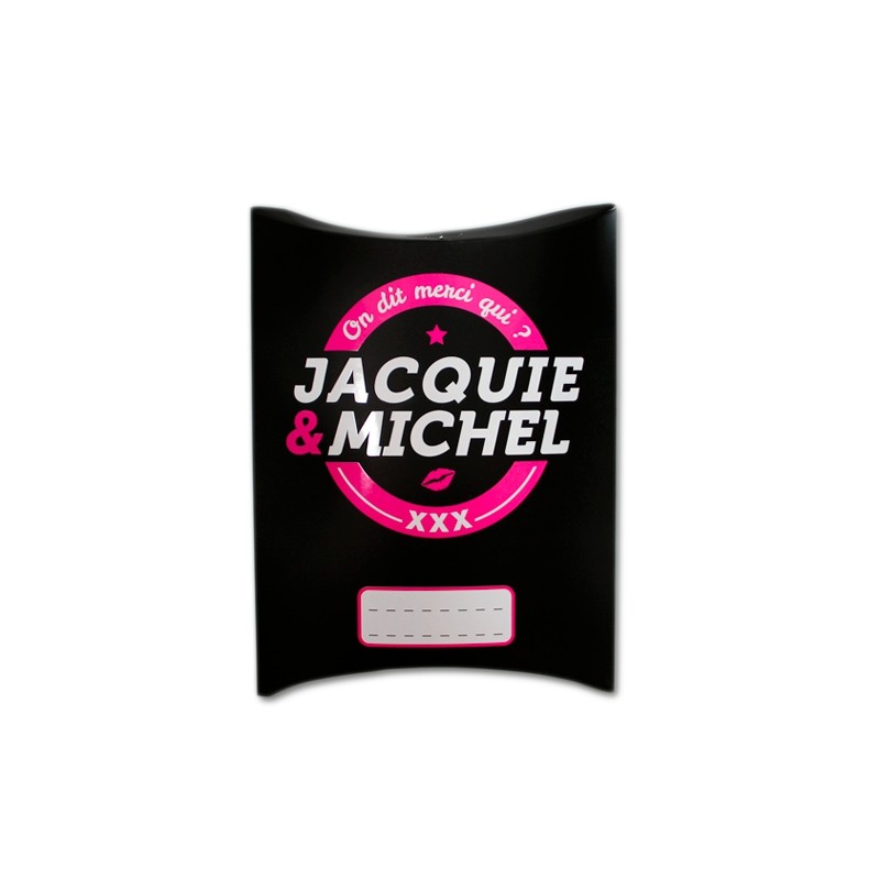 Jacquie et Michel propose une superbe petite boite cadeau en carton, arborant le célèbre slogan "On dit merci qui?".