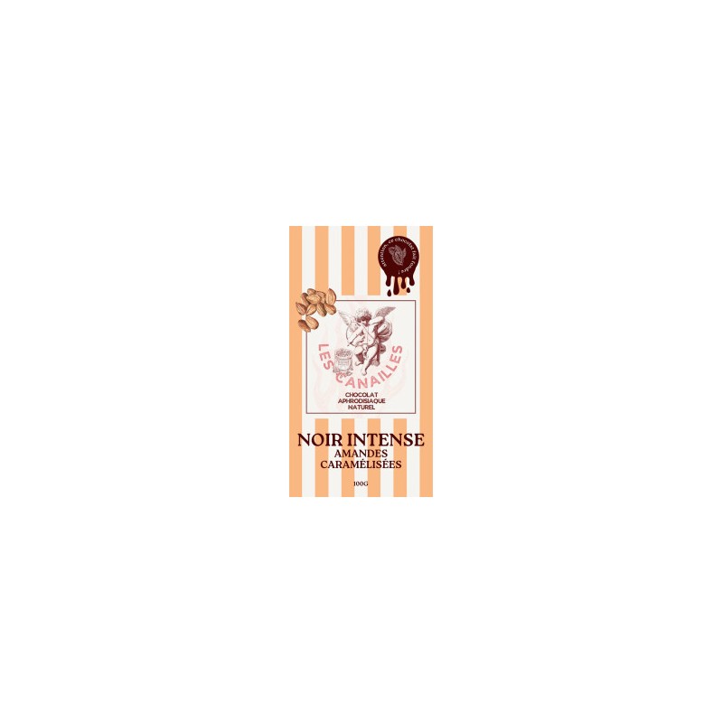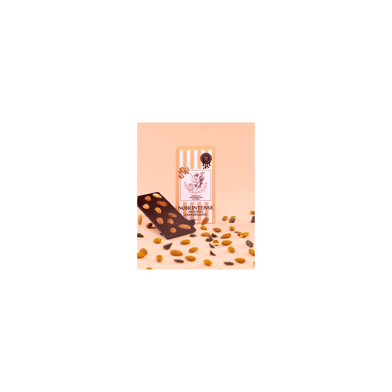 Tablette de chocolat aphrodisiaque noir intense aux amandes caramélisées.
