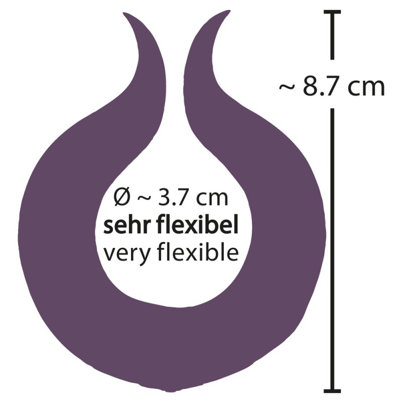 Longueur totale 8,7 cm ; forme d'anneau Ø 3,7 cm, très flexible. 56 g. Silicone, PU, ABS.