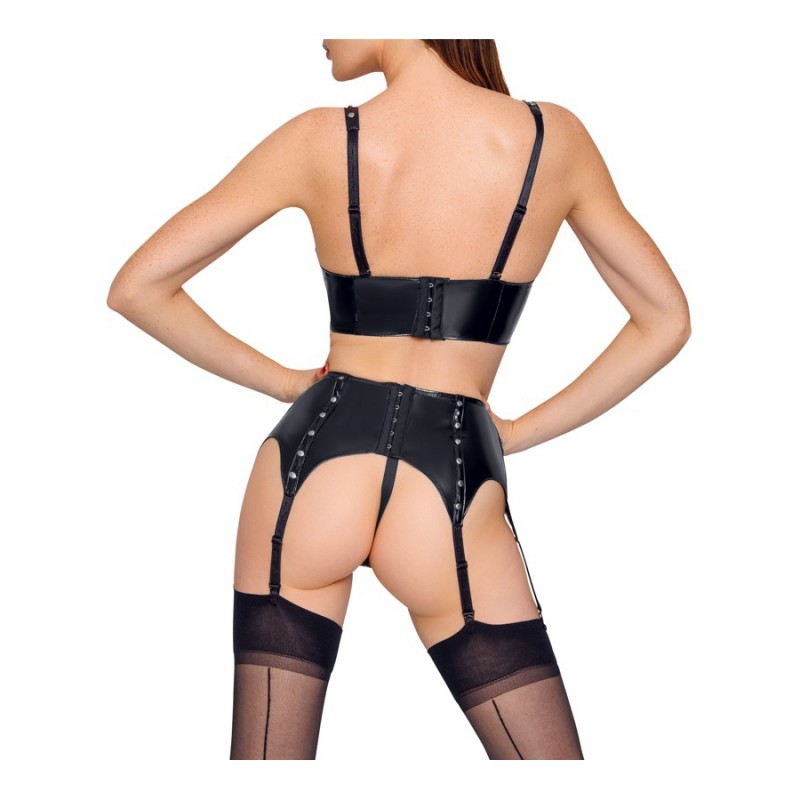 L'ensemble est composé d'un soutien-gorge ouvert à armatures, d'un porte-jarretelles à 6 attaches et d'un string.