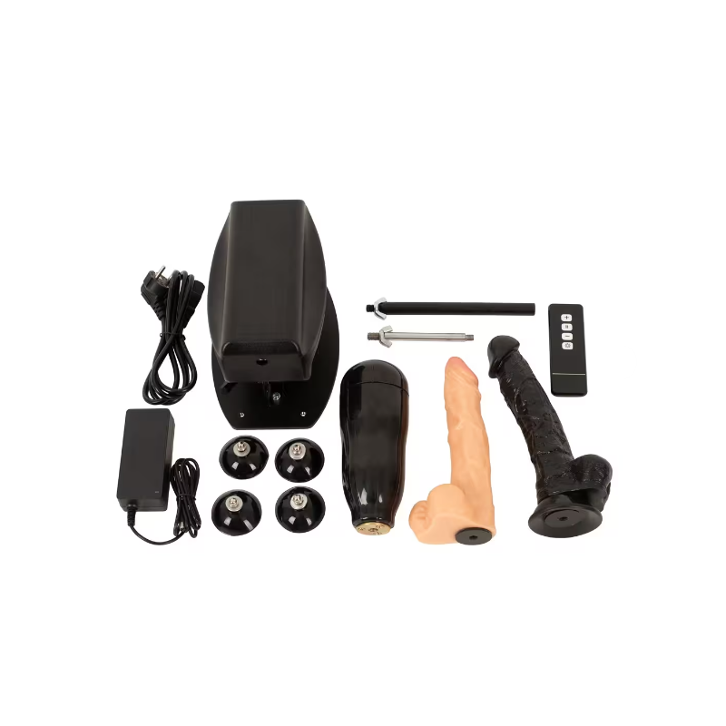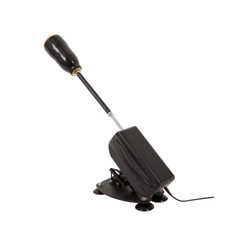 Machine sexuelle (22 cm x 15 cm x 16 cm) avec tige de rallonge (20 cm de long). Métal, ABS, PVC, TPE.