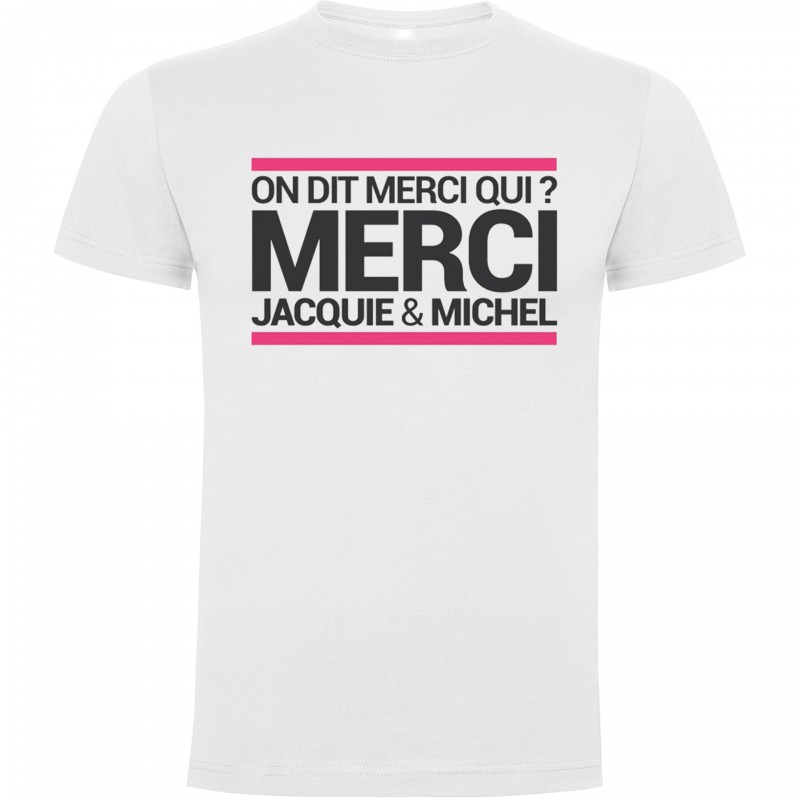 Nouveau modèle exclusif de la collection de tee-shirts Jacquie et Michel, visuel n°9, tee-shirt blanc avec visuel "on dit merci qui?" sur la poitrine.